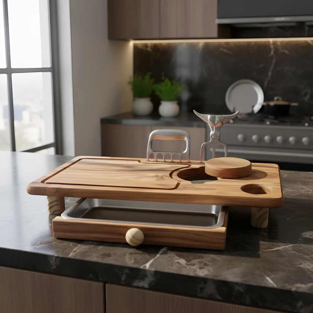 Kit Tabua De Carne Churrasco C/bandeja Alumínio Garra/garfo Lisa Marrom