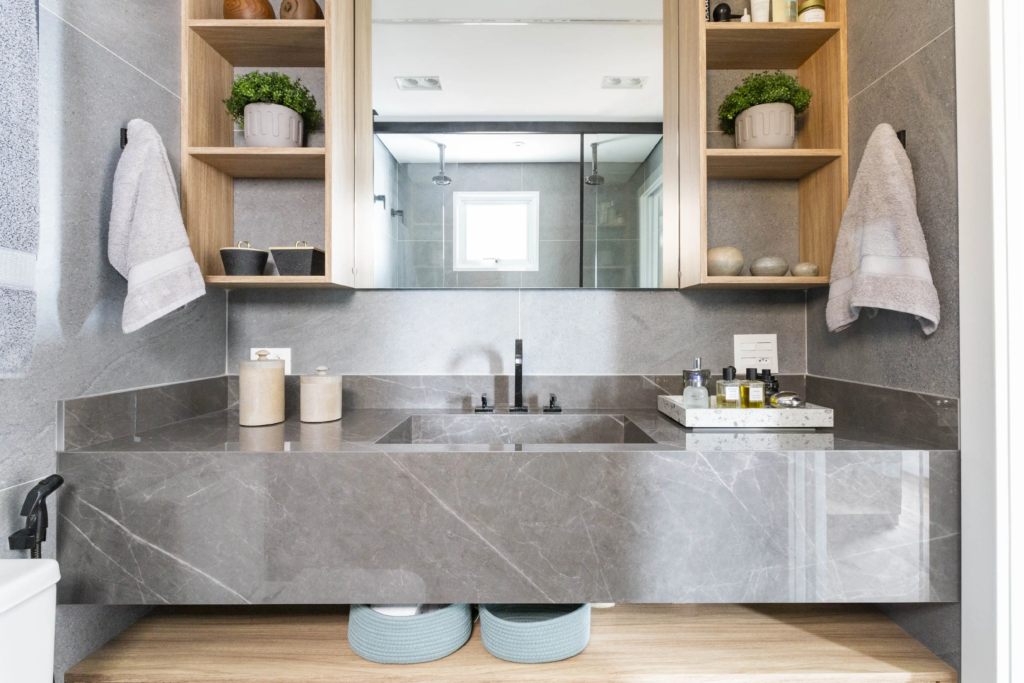 Espaço de higiene e praticidade. Chuveiro de qualidade, espelho com LED e armário organizado deixam o ambiente mais moderno e funcional com produtos do Mercado Livre.